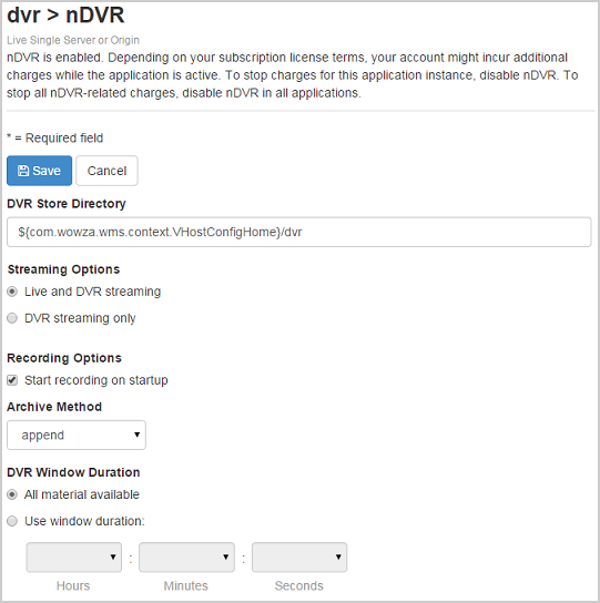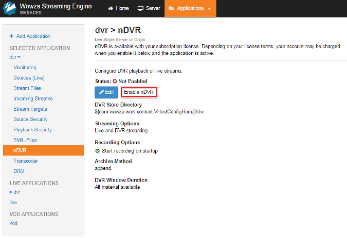 - 支持源/边缘(Origin/Edge)架构。请阅读如何为直播流中继(origin/edge)架构下使用Wowza nDVR .
