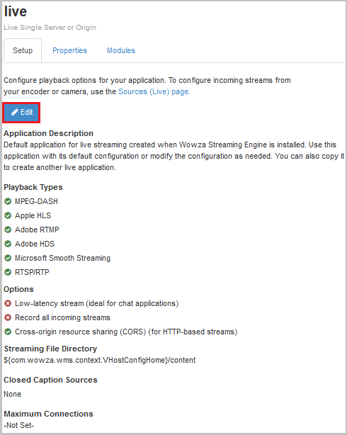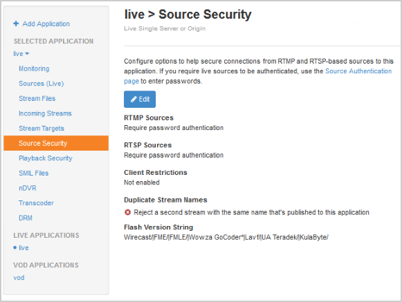 注意: 要管理这个推流认证的用户名和密码,请点击Source Authentication菜单。这个会带你进入server级别的Source Authentication界面,在那里,你可以对用户名密码做添加、编辑、删除操作。 你如果使用了Custom Password File location,那么你必须自己管理用户名和密码。 - 要改变现有的配置参数,请点击Edit.